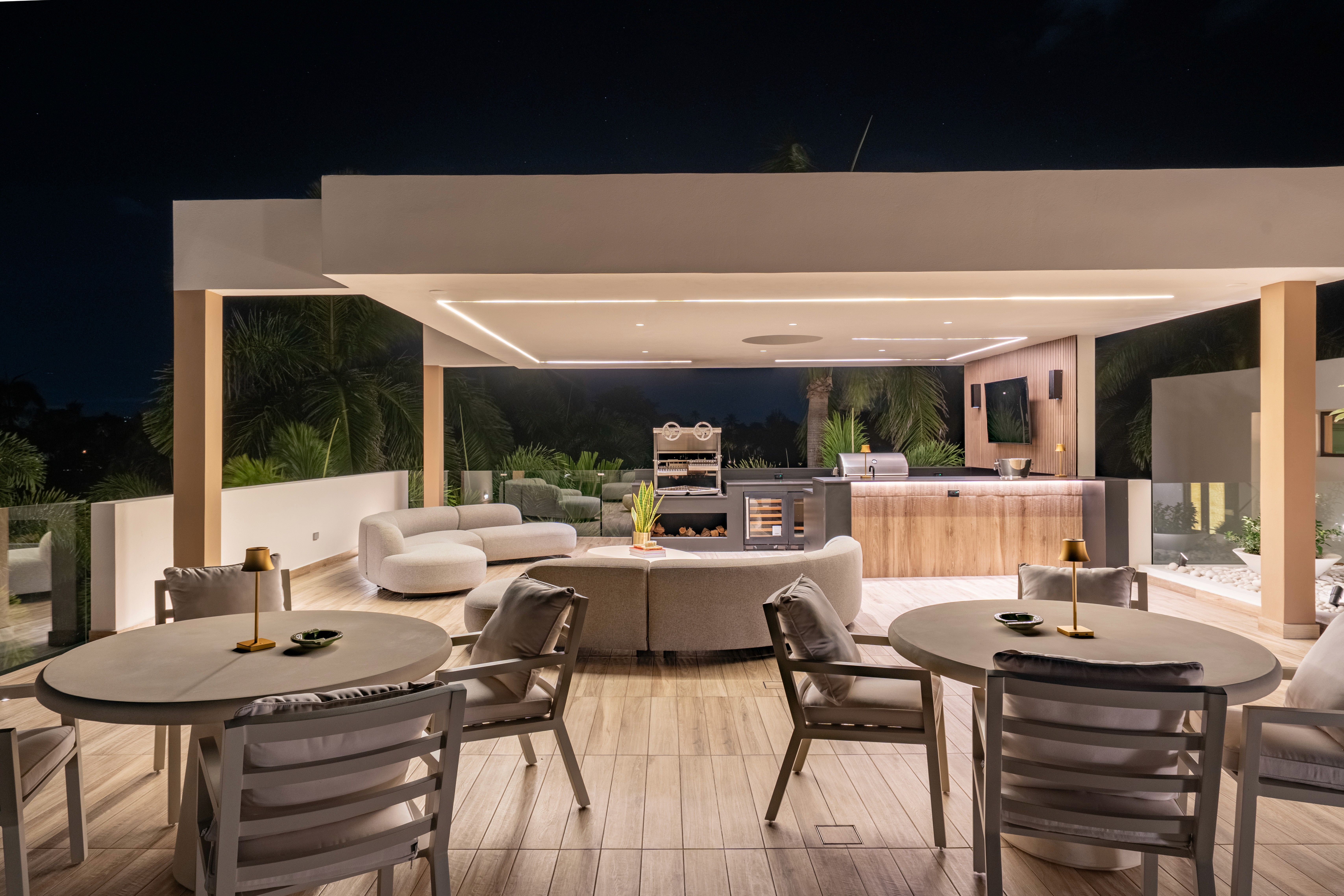 The second level of Villa D’Or is a masterclass in elevated entertaining. The centerpiece is the stunning glass-walled jacuzzi, positioned on the terrace to offer panoramic ocean and fairway vistas while you soak. This rooftop destination features a professional Grillworks wood-fired parrilla and a sunken lounge for seamless hosting. Inside, the atmosphere shifts to a private nightclub vibe with a backlit marble bar, Baccarat lighting, and a sound-paneled media room for the ultimate escape.